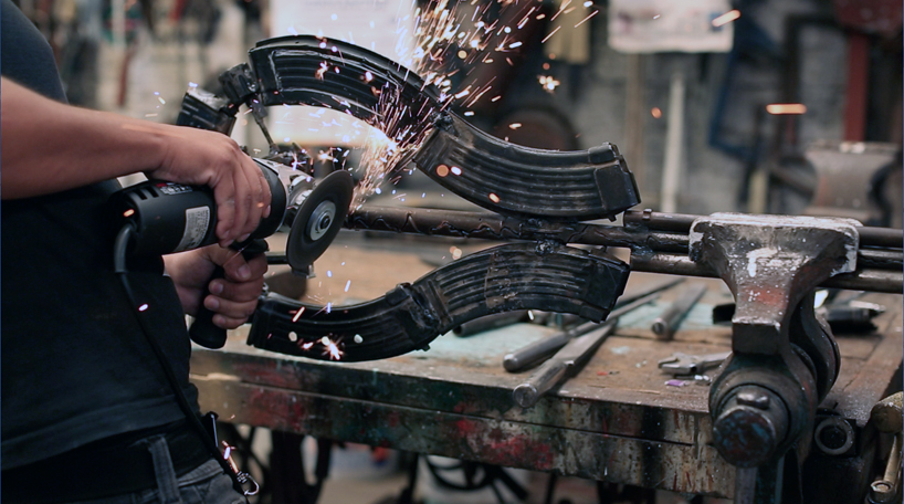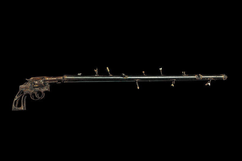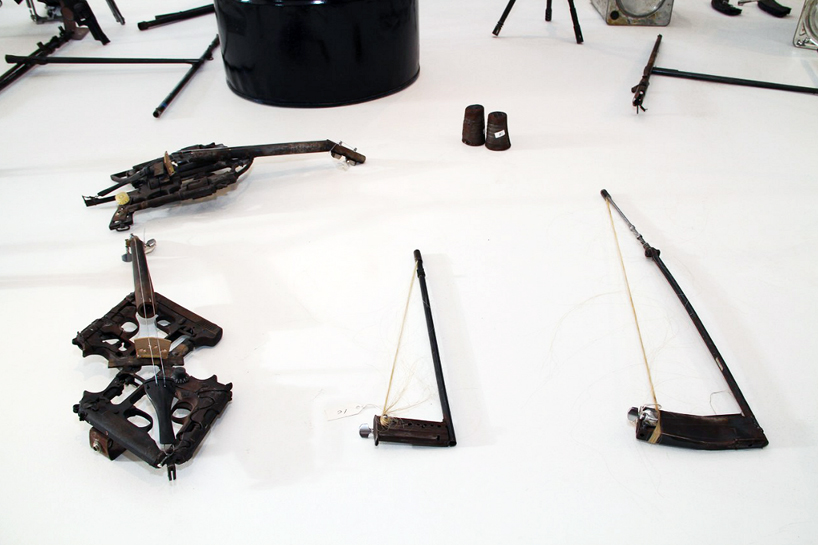 his most recent project 'imagine' is a set of 50 musical instruments also fabricated out of a variety of firearms including revolvers,